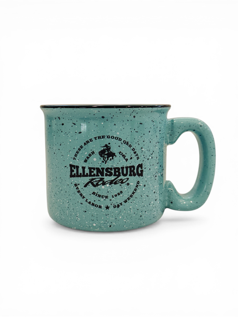 Aqua 15 oz ceramic campfire mug with "Good Old Days" logo.