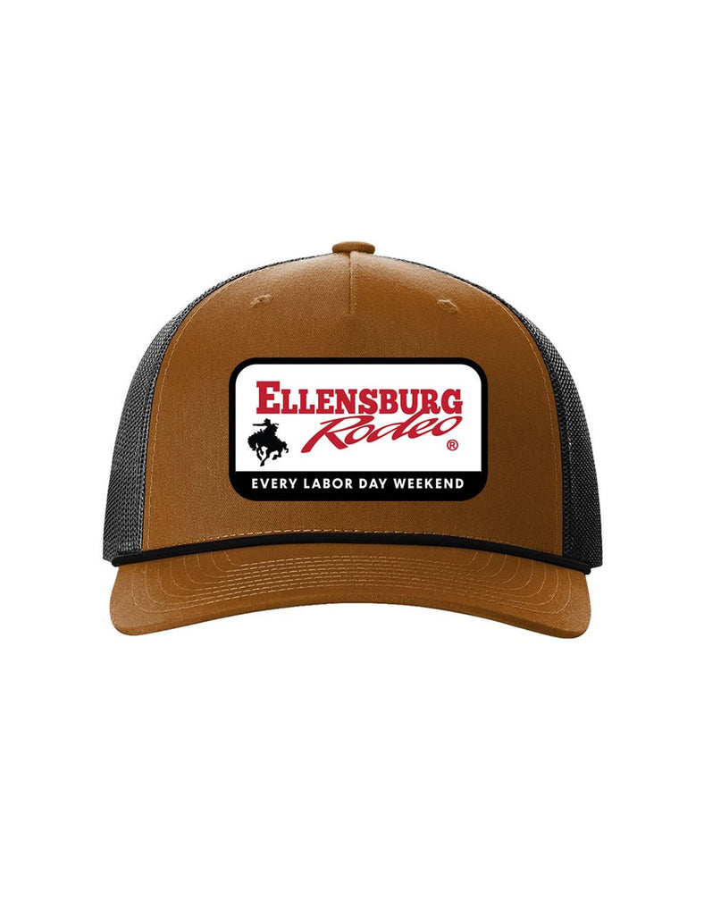 Carmel/Black - 5 panel, precurved bill. Stand sweatband. Cotton-Polyester Twill/Trucker Mesh. Snapback.